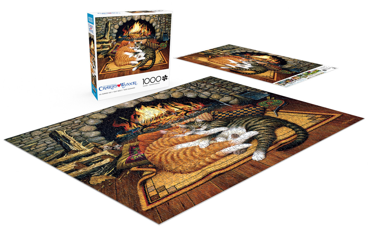 Buffalo GamesThis 1000-piece 26.75 x 19.75 inch interlocking Buffalo Games jigsaw puzzle for ages 14+ features art by Charles Wysocki and is titled ""All Burned Out"". It features a pair of cats cuddling together on a rug and a pile of pillows in front of a roaring fire in a rustic stone fireplace.