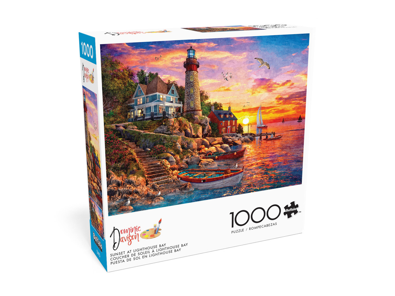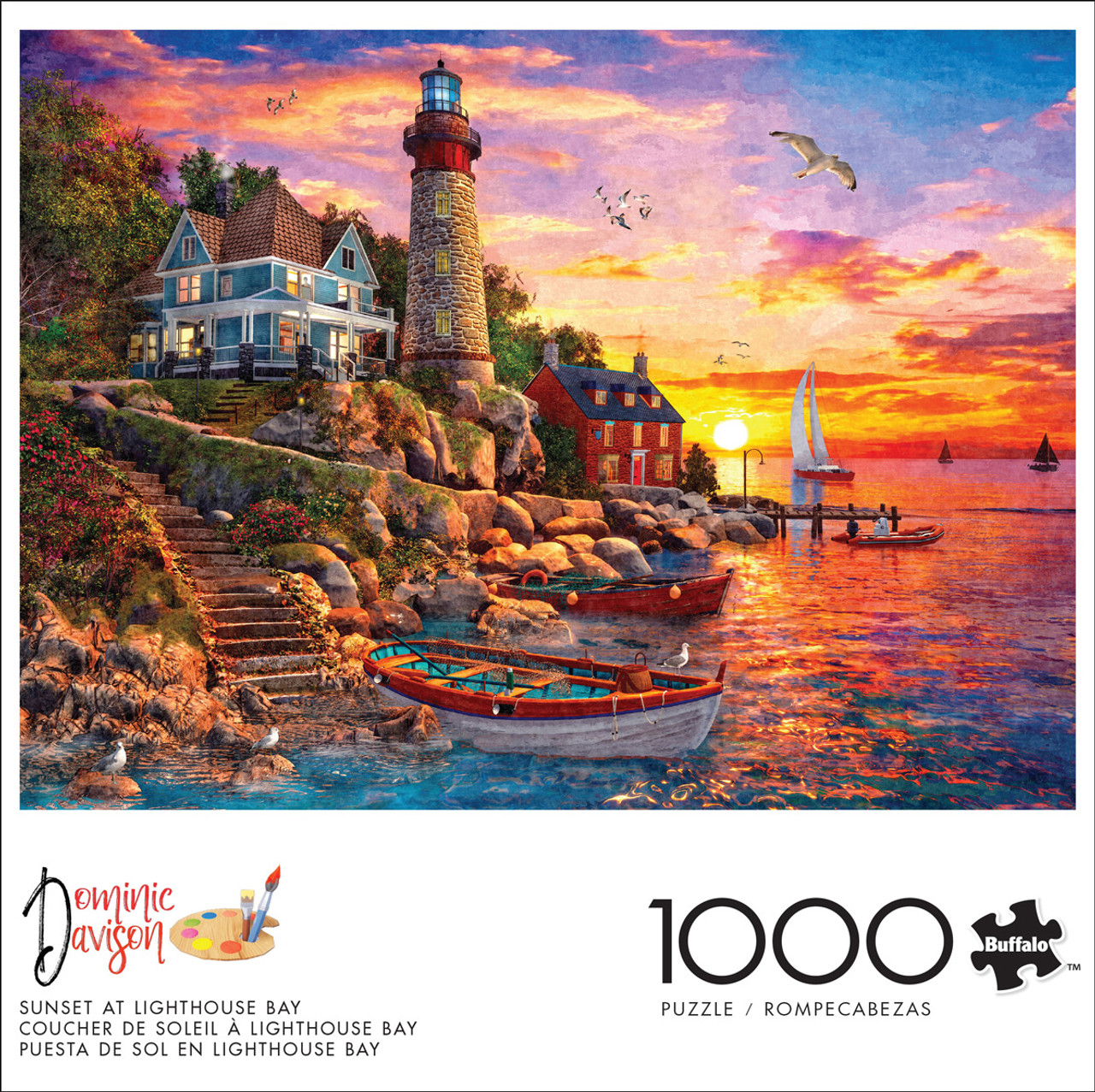 Buffalo GamesThis 1000-piece jigsaw puzzle by Buffalo Games is from the Signature Collection and is titled ""Sunset at Lighthouse Bay"". It features art by Dominic Davison, showing a gorgeous sunset rising above a rocky outcropping where a lighthouse stands watching over the sea. Every Buffalo Games jigsaw puzzle is manufactured from recycled puzzle board. A precision cutting technique guarantees that every piece will fit soundly with the company's signature Perfect Snap™. A bonus puzzle poster is also included so that you have a handy reference of what the completed puzzle should look like while you put yours together.