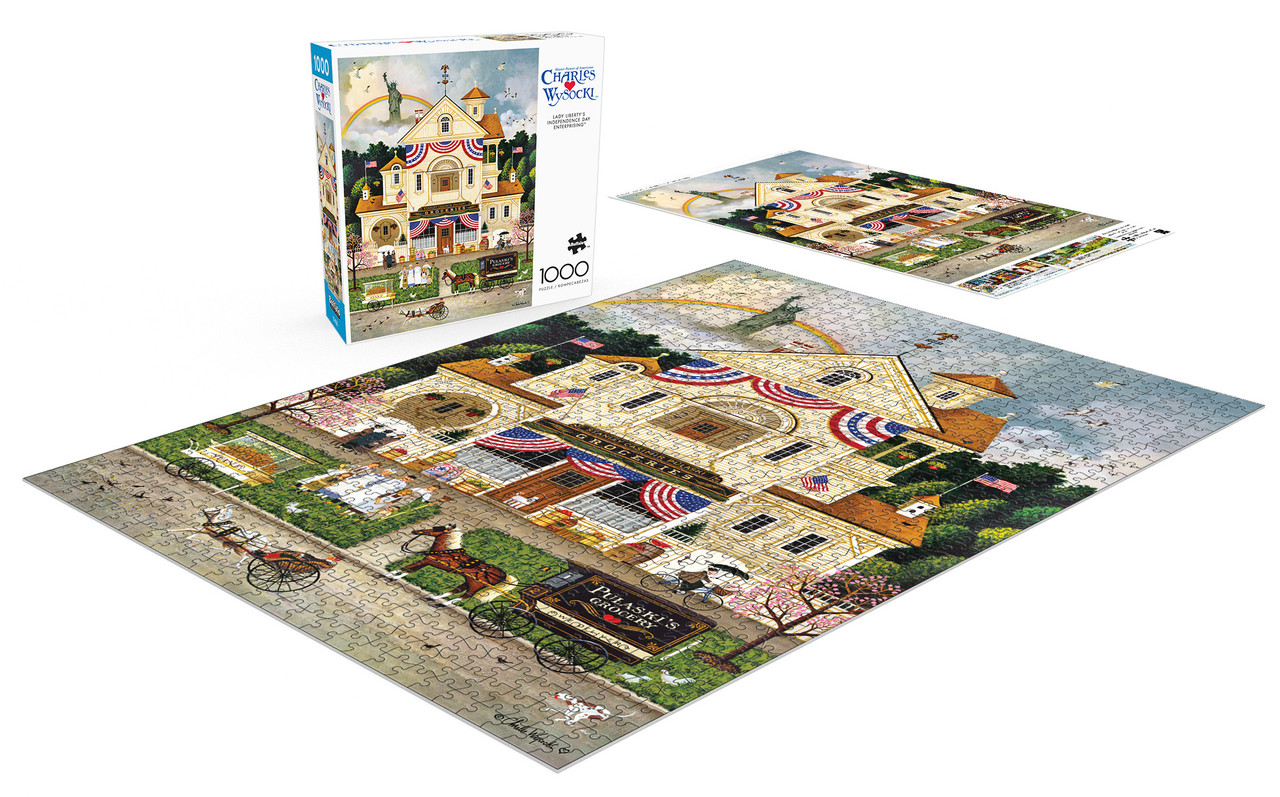Buffalo GamesThis 1000-piece 26.75 x 19.75 inch interlocking Buffalo Games jigsaw puzzle for ages 14+ features art by Charles Wysocki and is titled ""Lady Liberty's Independence Day"". It features a house bedecked with American flag bunting, with the Statue of Liberty rising above the clouds and a rainbow behind it.