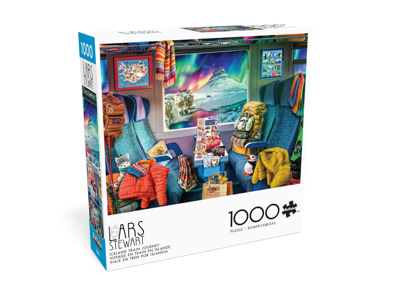This Buffalo Games 1000-piece 6.75 x 19.75 inch interlocking jigsaw puzzle for ages 14+, Iceland Train Journey, is based on the artwork of Lars Stewart. This scene transports you to a train window, where the Northern Lights are shining in all their beauty above a snowy mountain. The seats of the train are strewn with backpacks, warm winter clothes, and colorful souvenirs from an Icelandic vacation.
