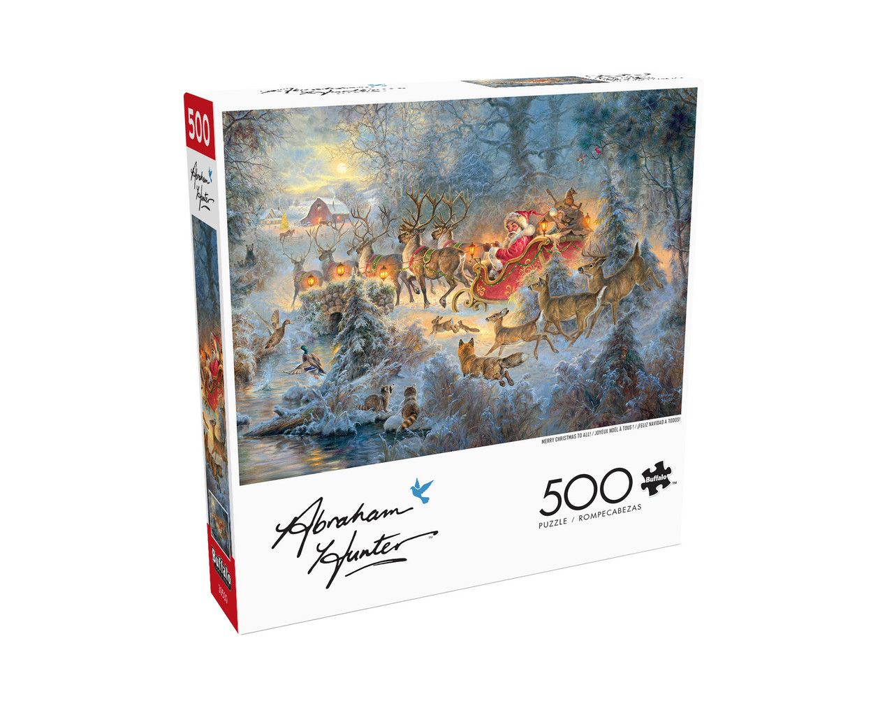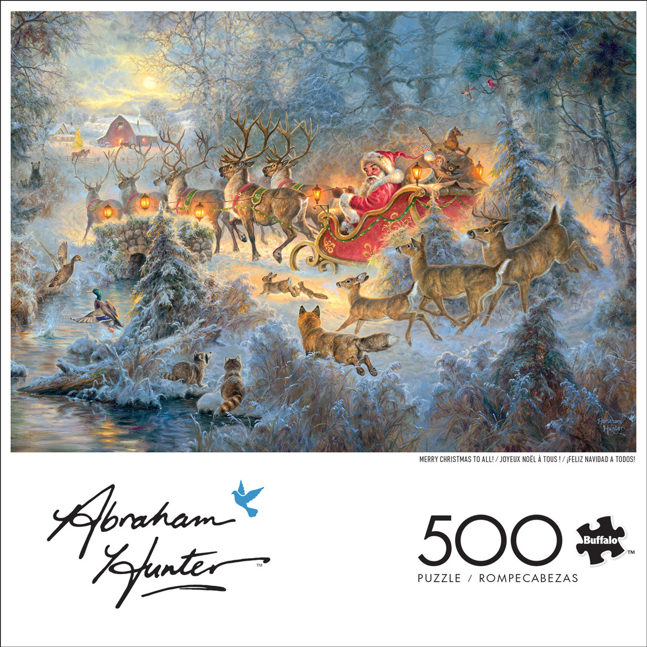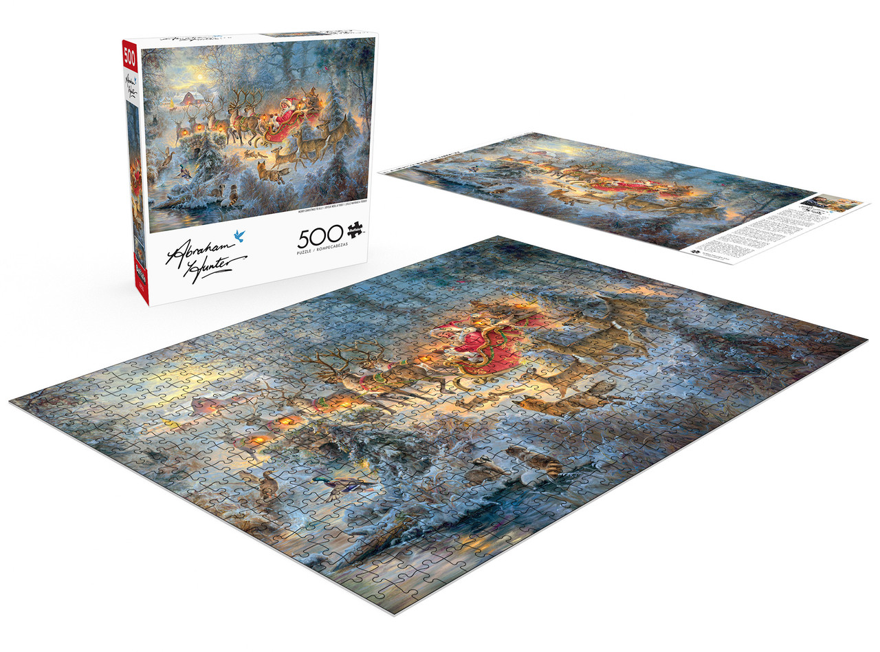 Buffalo GamesThis 500-piece 21.25 x 15 inch interlocking jigsaw puzzle for ages 14+, Merry Christmas to All, is by artist Abraham Hunter. This puzzle features Santa Claus riding his sleigh through a snowy forest, while the local deer, foxes, and raccoons watch his passage in awe. Each reindeer is adorned with a lantern to light their way through the morning mist.