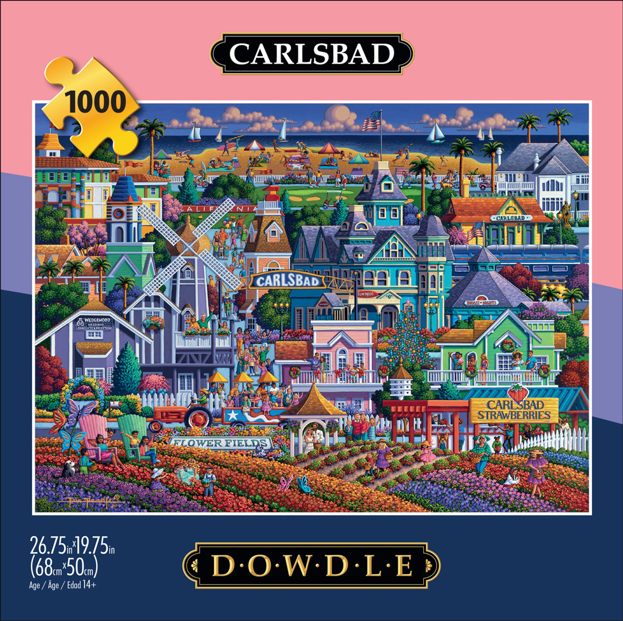 This 1000-piece jigsaw puzzle titled “Carlsbad” is based on the artwork of Eric Dowdle. This artwork showcases the picturesque coastland of Carlsbad, California. Indulge in the city’s stunning beaches, world-class golf courses, colorful architecture, and flowing fields of flowers and nature when you piece this charming puzzle together.