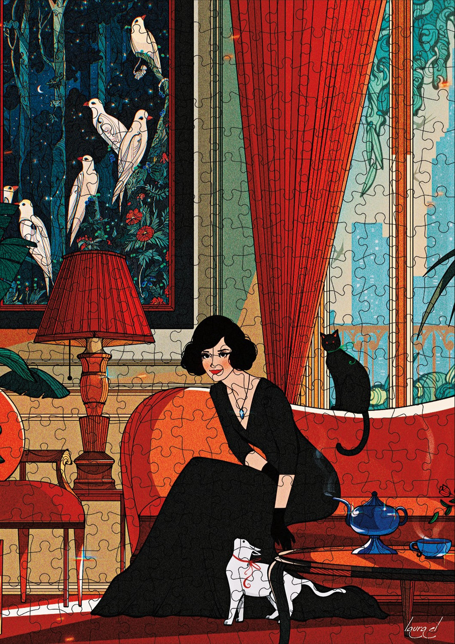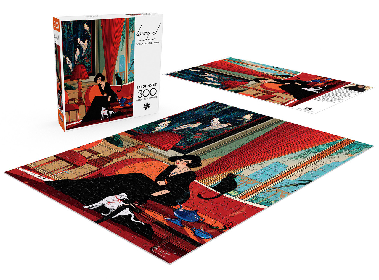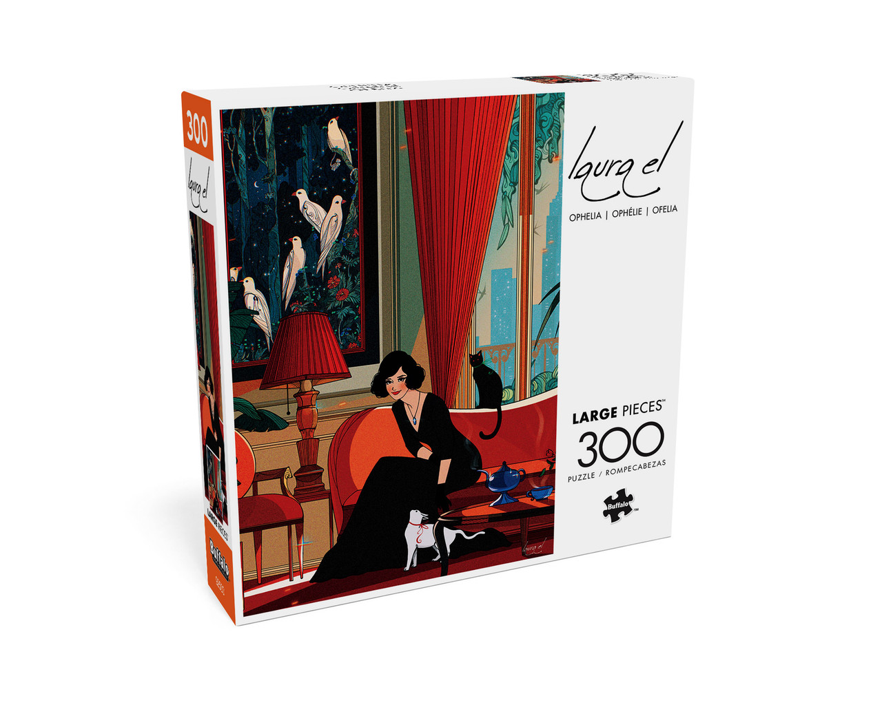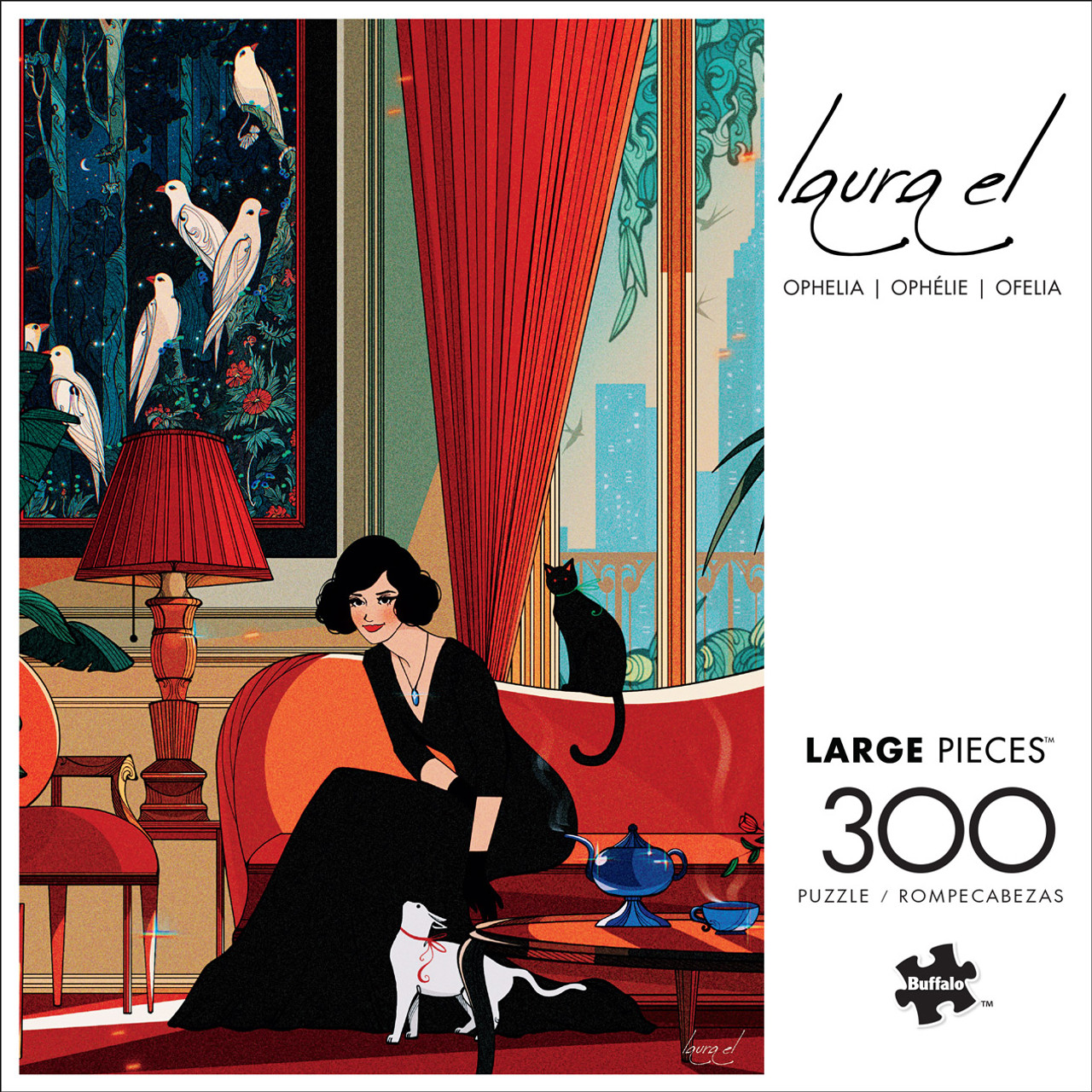 This 300-piece 21.25 x 15 inch interlocking jigsaw puzzle for ages 14+ by Buffalo Games is from the Large Pieces Collection and is titled Ophelia. It features art by Laura El of a young woman in a stylish black dress, sitting in an elegant parlor with her two cats.