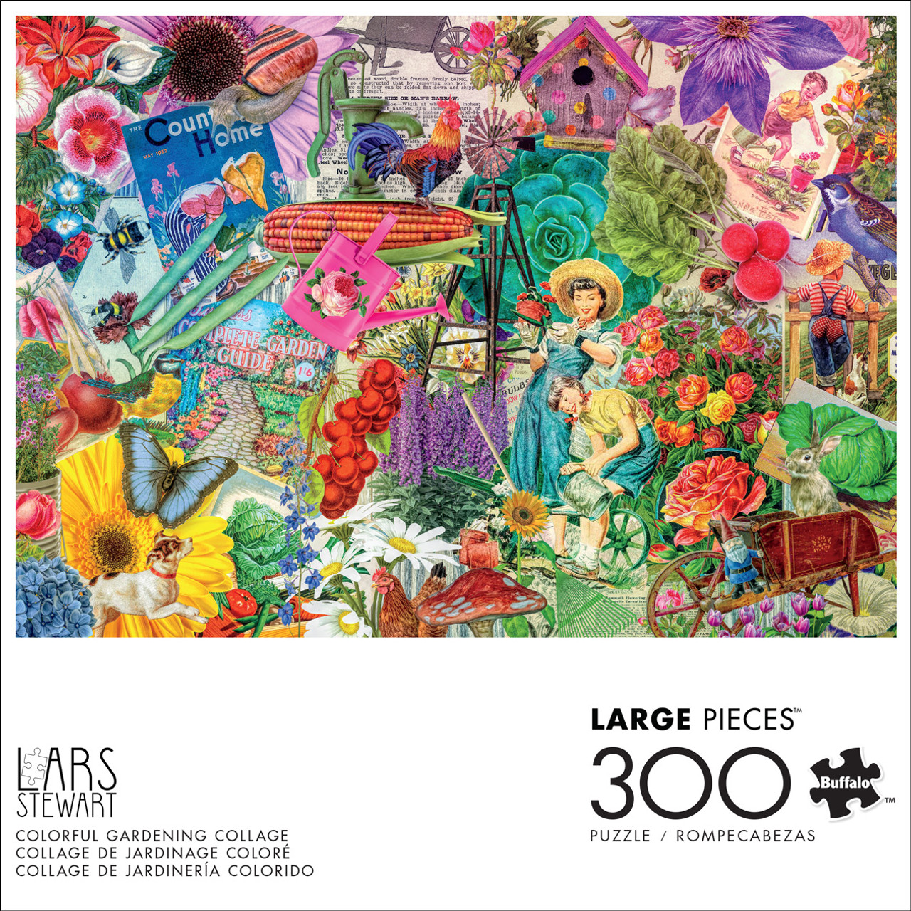 Buffalo GamesThis 300-piece jigsaw puzzle by Buffalo Games is from the Large Pieces Collection and is titled Colorful Gardening Collage. It features a cheerful collage of vintage illustrations of flowers, vegetables, gardeners and othe garden-related imagery.