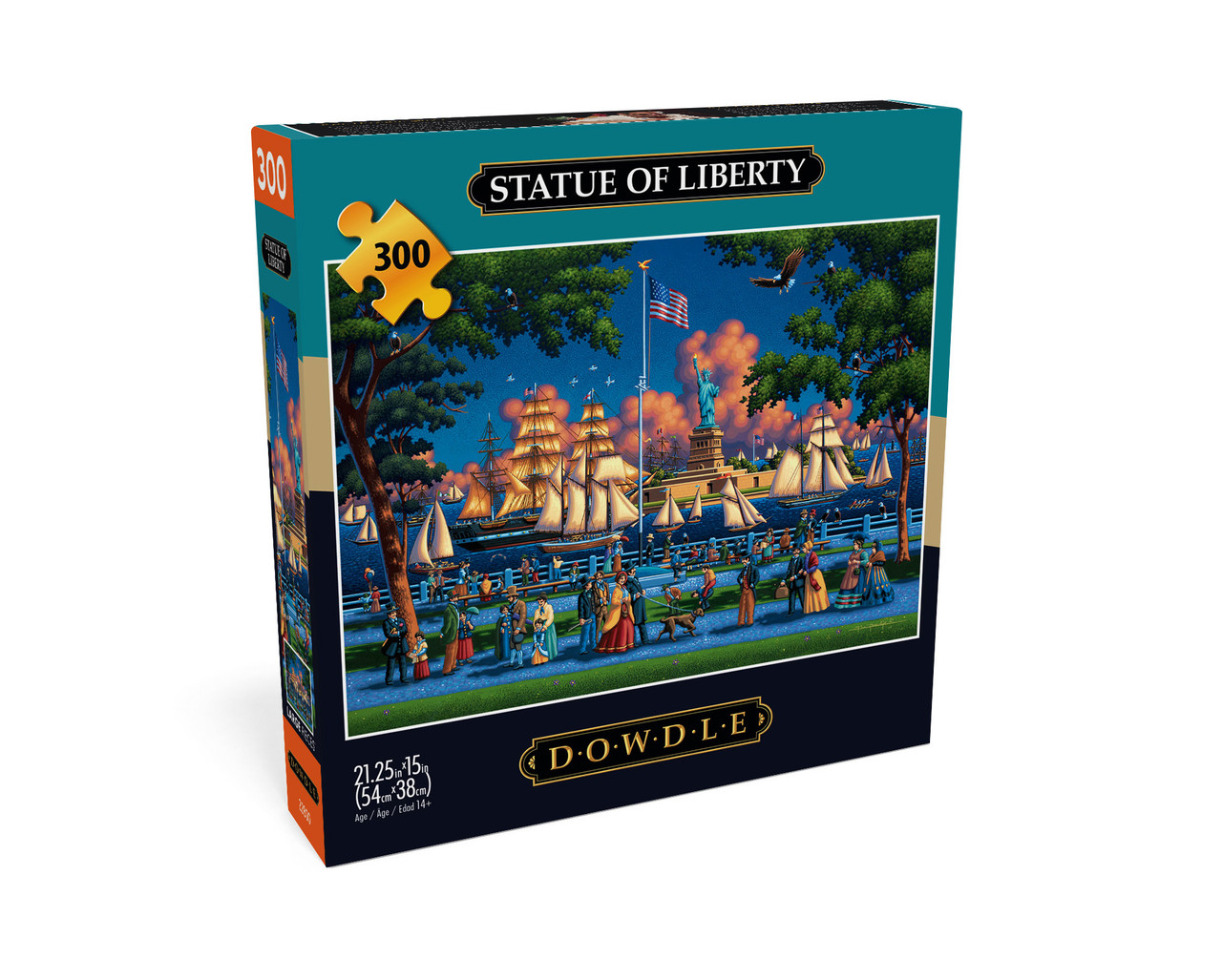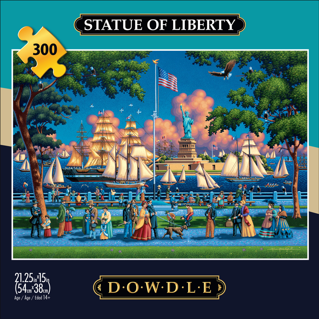 This 300-piece jigsaw puzzle titled “Statue of Liberty” is based on the artwork of Eric Dowdle. This image features Lady Liberty herself surrounded by sailing ships, as sharply dressed Victorians meet and greet one another on the other side of the harbor.