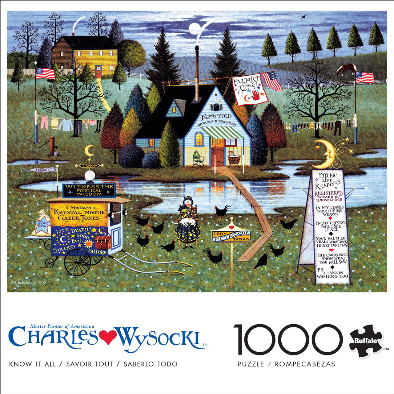 This 1000-piece 26.75 x 19.75 inch interlocking Buffalo Games jigsaw puzzle for ages 14+ features art by Charles Wysocki and is titled ""Know it All"". It features a fortune-teller, sitting in front of her house adorned with signs and advertisements for her psychic services, and stroking a white cat.