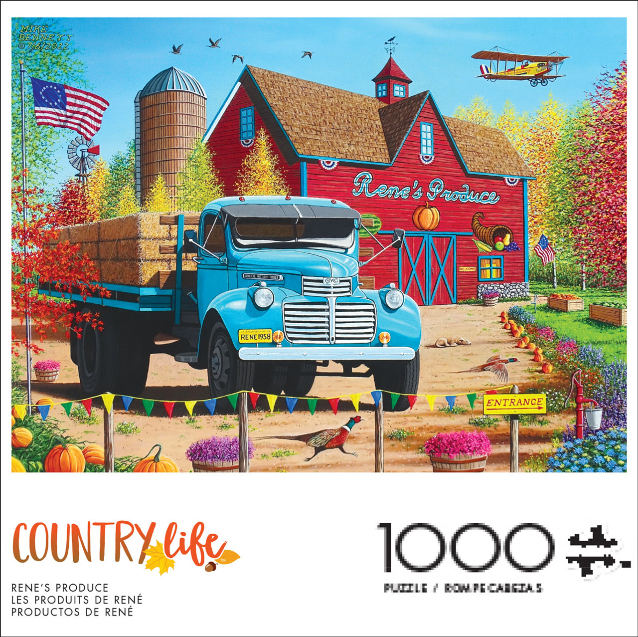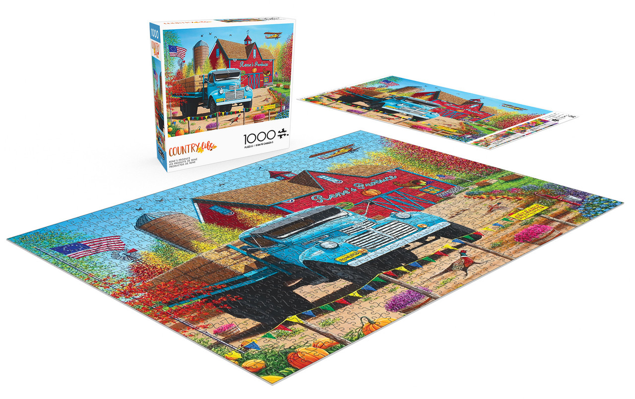 Buffalo GamesThis 1000-piece jigsaw puzzle by Buffalo Games is from the Country Life Collection and is titled Rene's Produce. This puzzle features a red barn advertising the titular produce stand, with a powder-blue pickup truck parked in front of it piled high with hay bales.