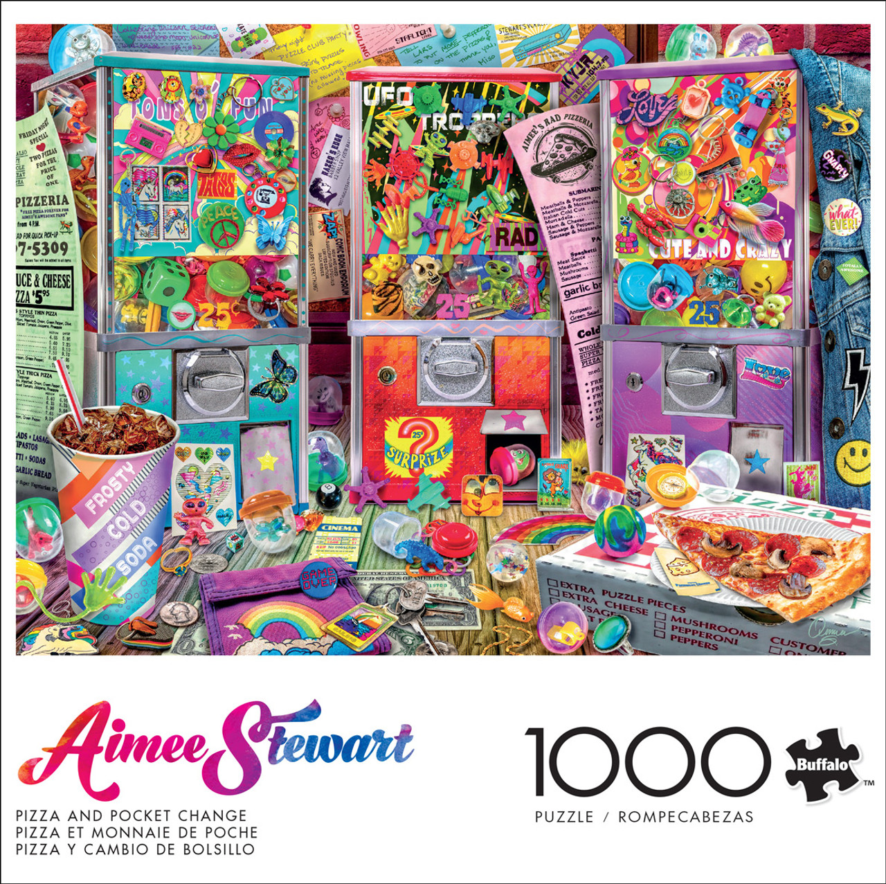 Buffalo GamesThis 1000-piece jigsaw puzzle is from the Buffalo Games Aimee Stewart Collection and is titled ""Pizza and Pocket Change"". It features a slice of pizza sitting on a pizza box next to a trio of prize machines, each one offering colorful mystery trinkets, many of which are piled around them on the table.