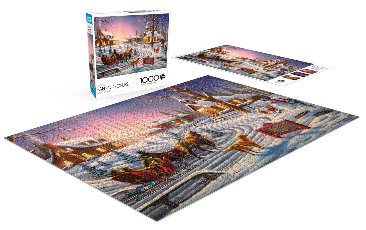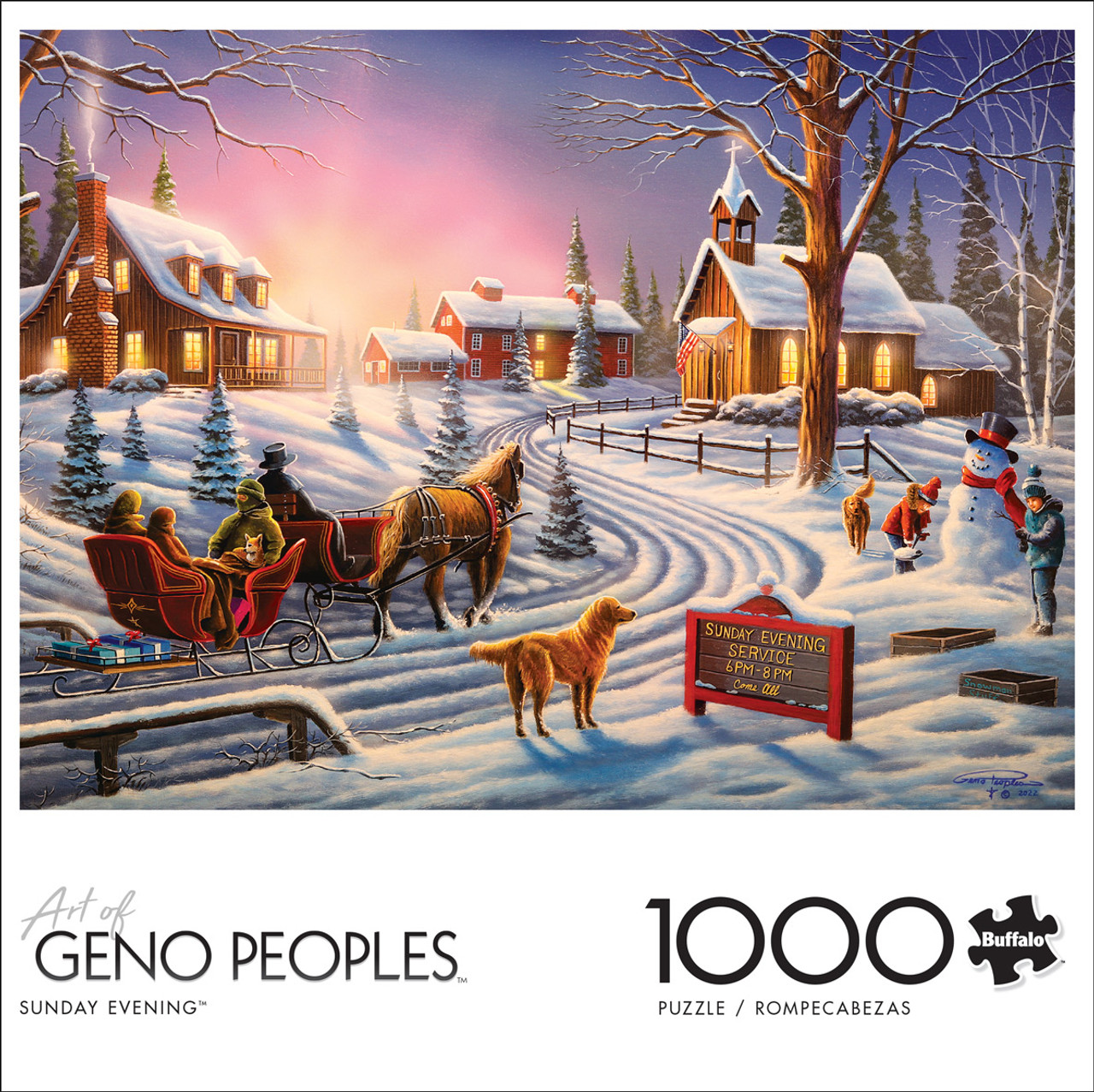 Buffalo GamesThis 1000-Piece jigsaw puzzle by Buffalo Games is titled Sunday Evening and is based on the Art of Geno Peoples. Visit a quiet, charming, snow-covered town as a horse-drawn sleigh is heading to the Sunday evening service. They pass the dogs and kids who are building a snowman.