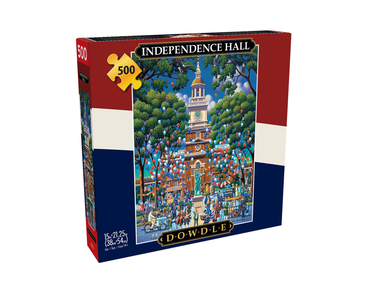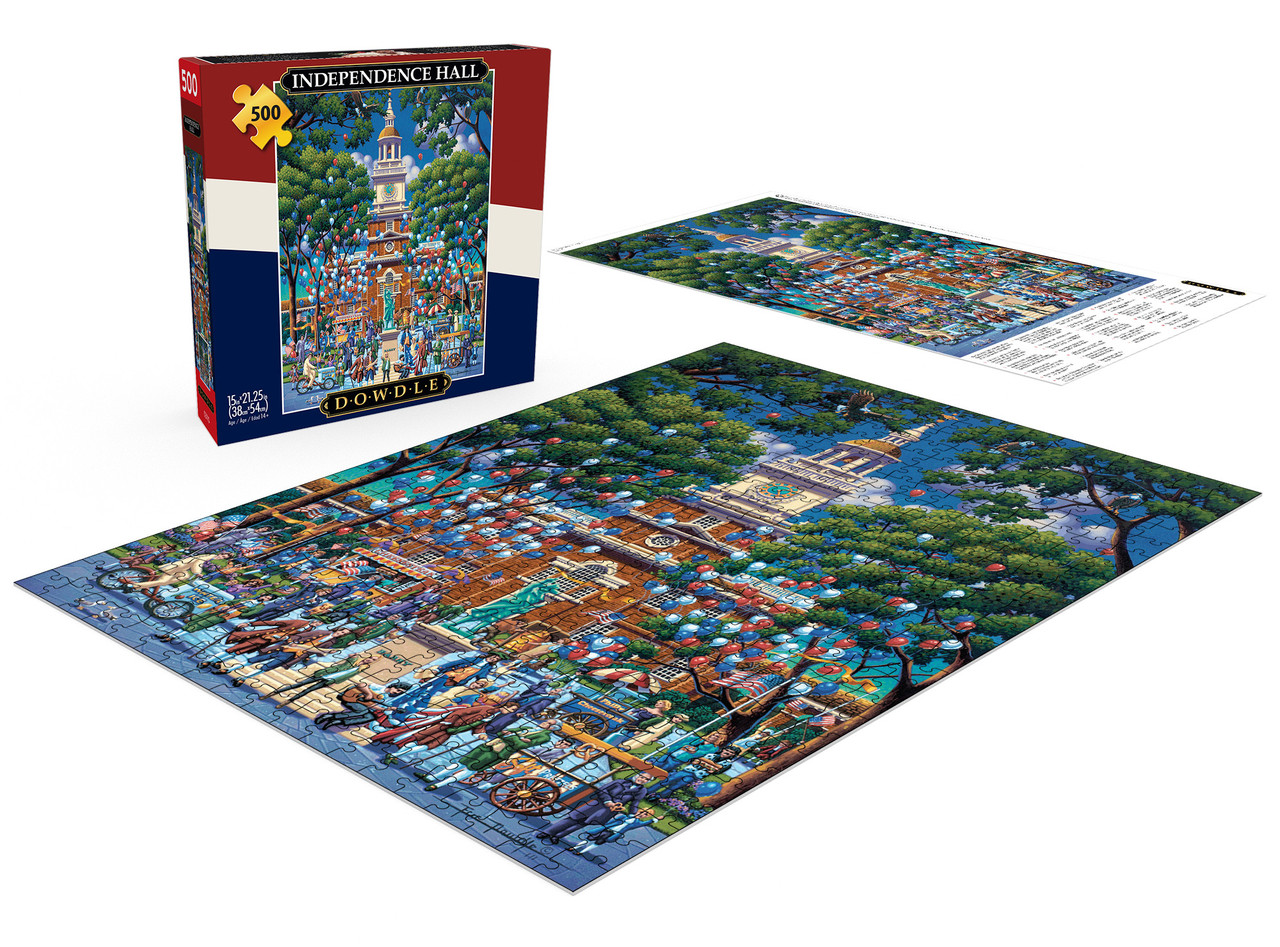 This 500-piece jigsaw puzzle by Buffalo Games is from the Americana Collection and is titled "Independence Hall". It features art by Eric Dowdle, depicting a patriotic celebration complete with re-enactors and red, white and blue balloons, outside the famous Philadelphia landmark.