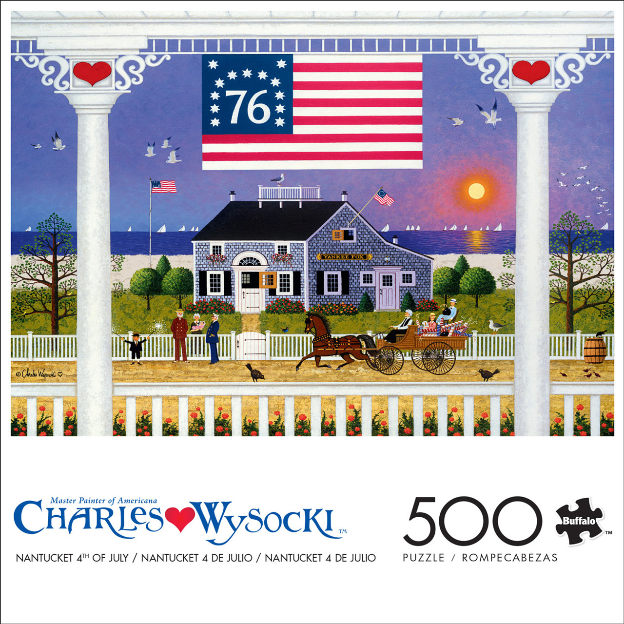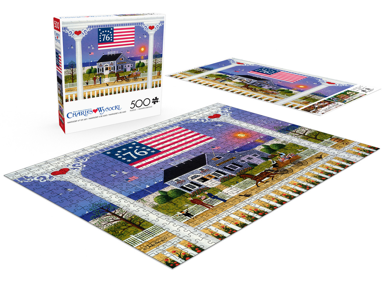 Buffalo GamesThis 21.25 x 15 inch interlocking 500-piece jigsaw puzzle for ages 14+, titled “Nantucket 4th of July” is based on the artwork of Charles Wysocki. This whimsical folk art painting features a seaside inn, joyful townsfolk, and a radiant sunset, framed by patriotic hearts and historical flair. A celebratory banner reading ""76"" waves proudly above, blending history with charm.